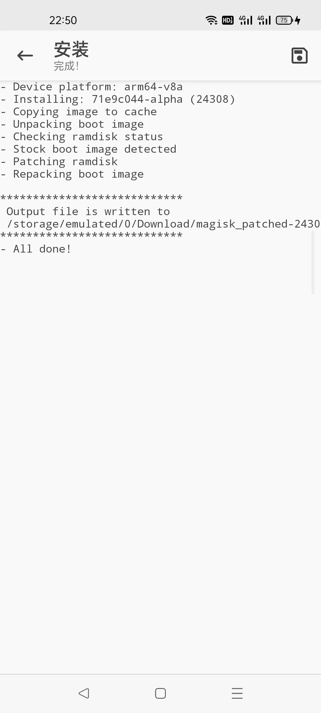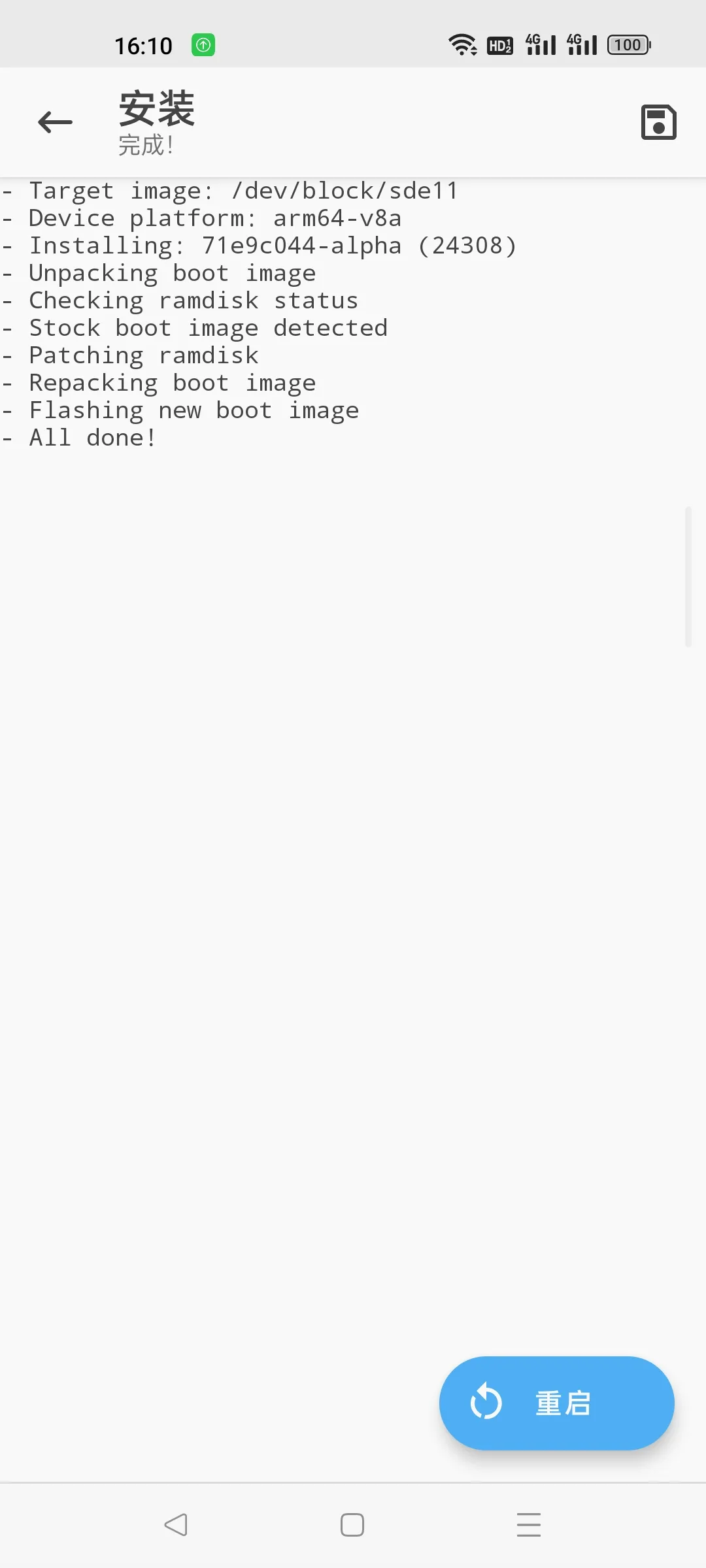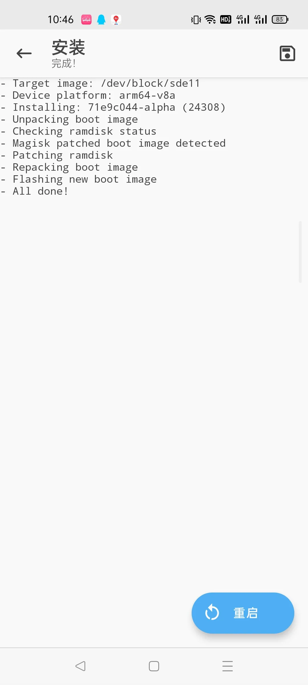 接下来,我们测试修补后的镜像是否正常工作。如果正常工作,接下来可以直接用 Magisk App 确认安装,不需要自行刷入。