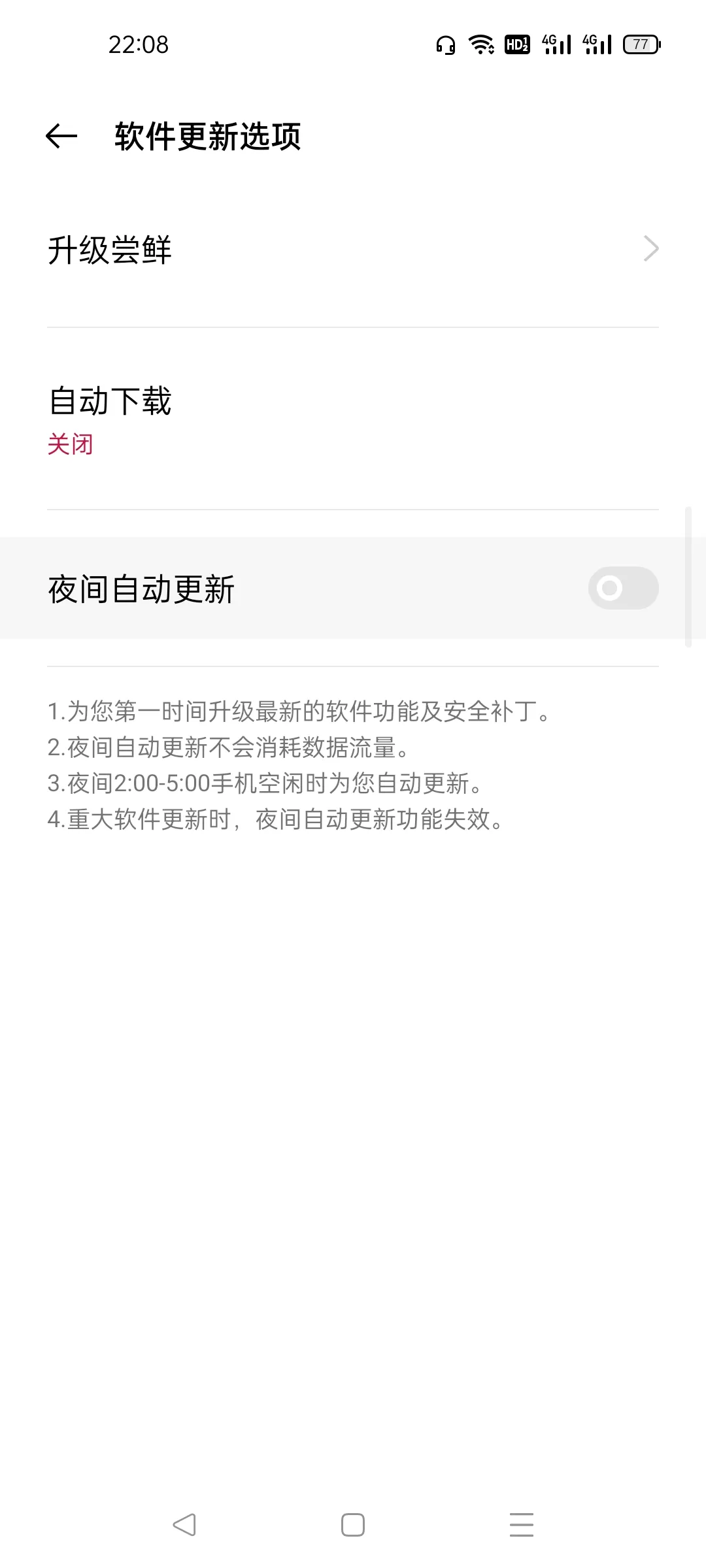 请先确保关闭“夜间自动安装”。然后下载更新,直至下载完成。先不要选择安装。