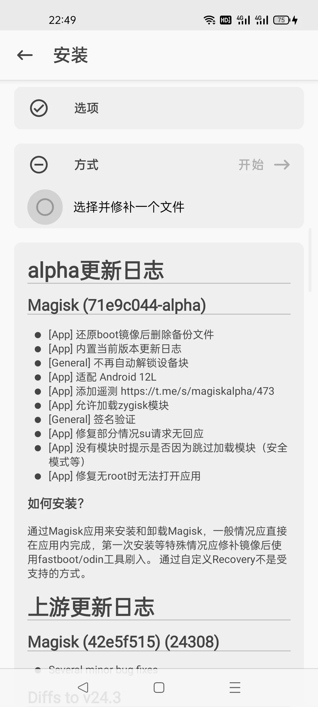 打开 Magisk App,点击“安装”,选择“选择并修补一个文件”,完成镜像修补。